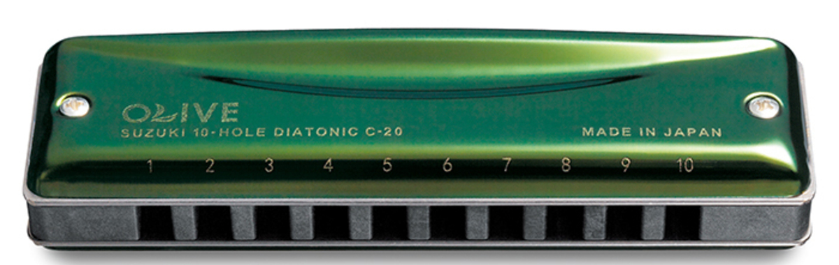SUZUKI OLIVE 10 HOLE DIATONIC HARMONICA, STAINLESS STEEL COVERPLATE, KEY OF C